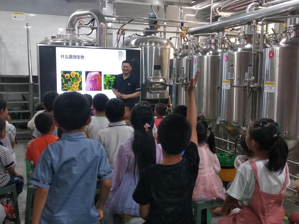 生命科学学院副院长赵海鹏带领小朋友们到学院一楼标本馆进行参观,为小朋友们讲解了部分植物和动物标本。参观过程中,标本馆中栩栩如生的动植物标本很快吸引了小朋友的目光,他们仔细地观察着标本,兴趣盎然、认真思考、互相讨论,不停地向赵老师询问着各种问题。学院生物工程系副主任李华带领小朋友们参观了学院的啤酒酿造车间,并为他们讲解了微生物的种类、何为微生物以及酿造啤酒的原料、过程等。小朋友们对啤酒酿造设备十分好奇,都想要知道设备罐里到底装的是什么,纷纷上前一探究竟。