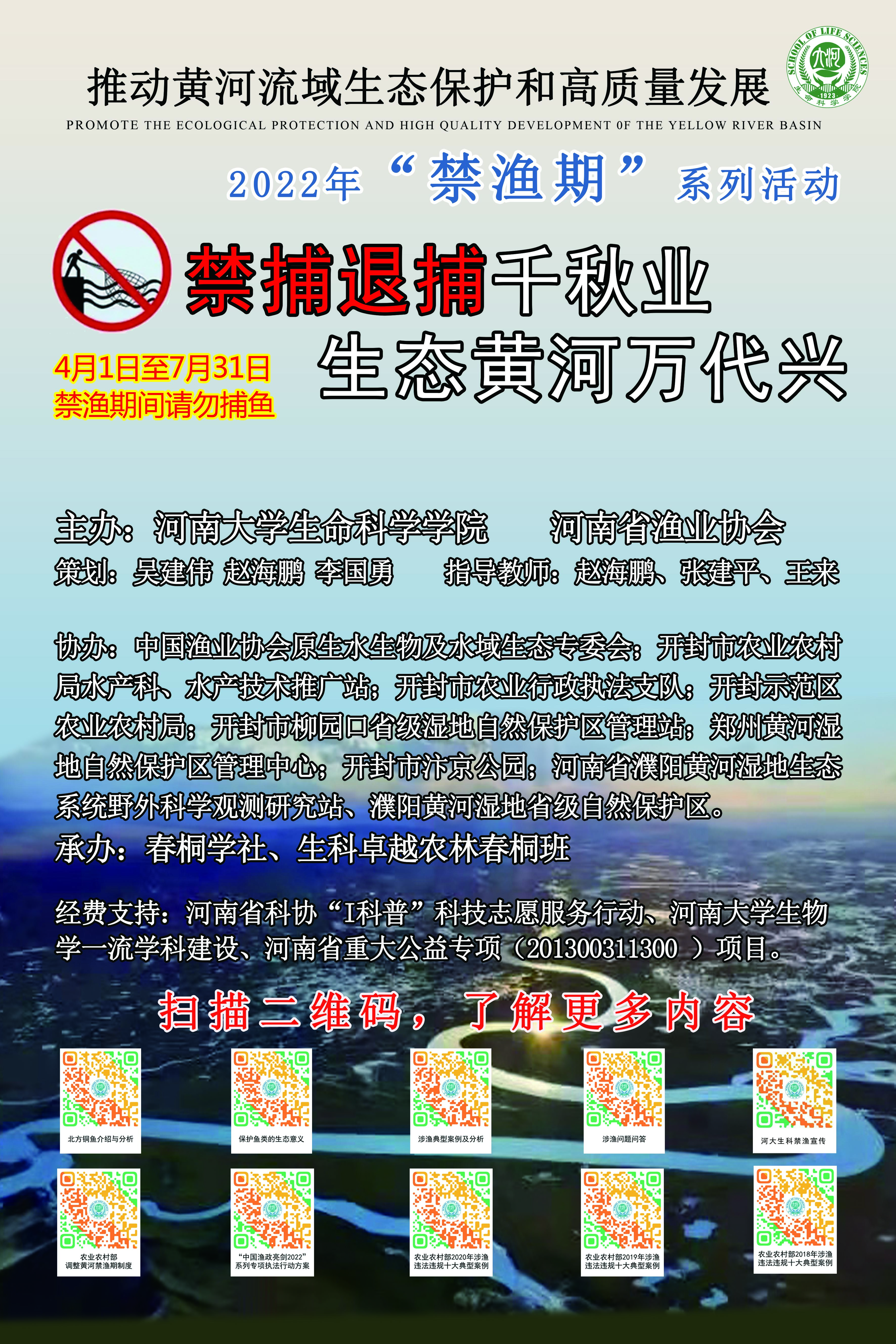上述活动期间,我院的自制禁渔宣传海报引起了广泛的关注和交口称赞,海报立足于“推动黄河流域生态保护和高质量发展”,围绕“禁捕退捕千秋业,生态黄河万代兴”主题,通过自制二维码将鱼类生态保护知识、涉鱼典型案例、黄河禁渔期制度以及专项执法行动方案等内容有机融入。