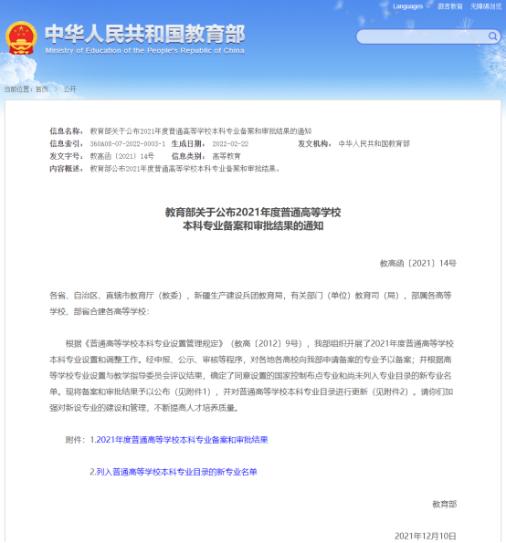 近日,教育部公布了2021年度普通高等学校本科专业备案和审批结果的通知(教高函〔2021〕14号),生命科学学院申报的生物信息学(071003)专业获教育部批准备案。