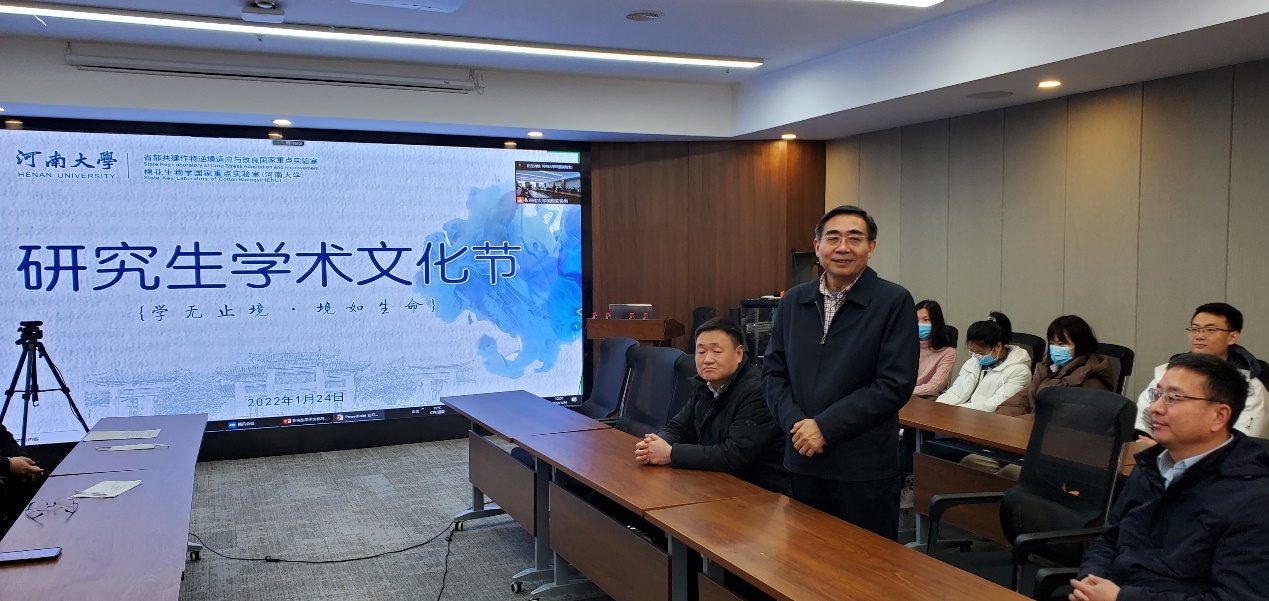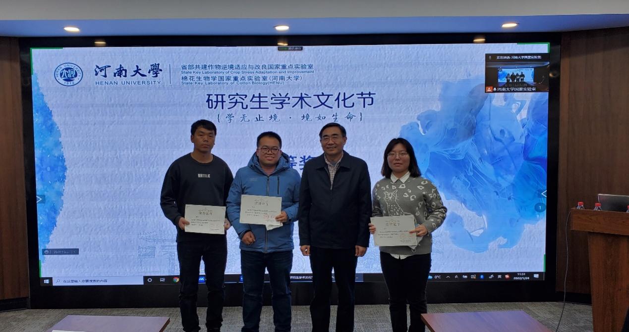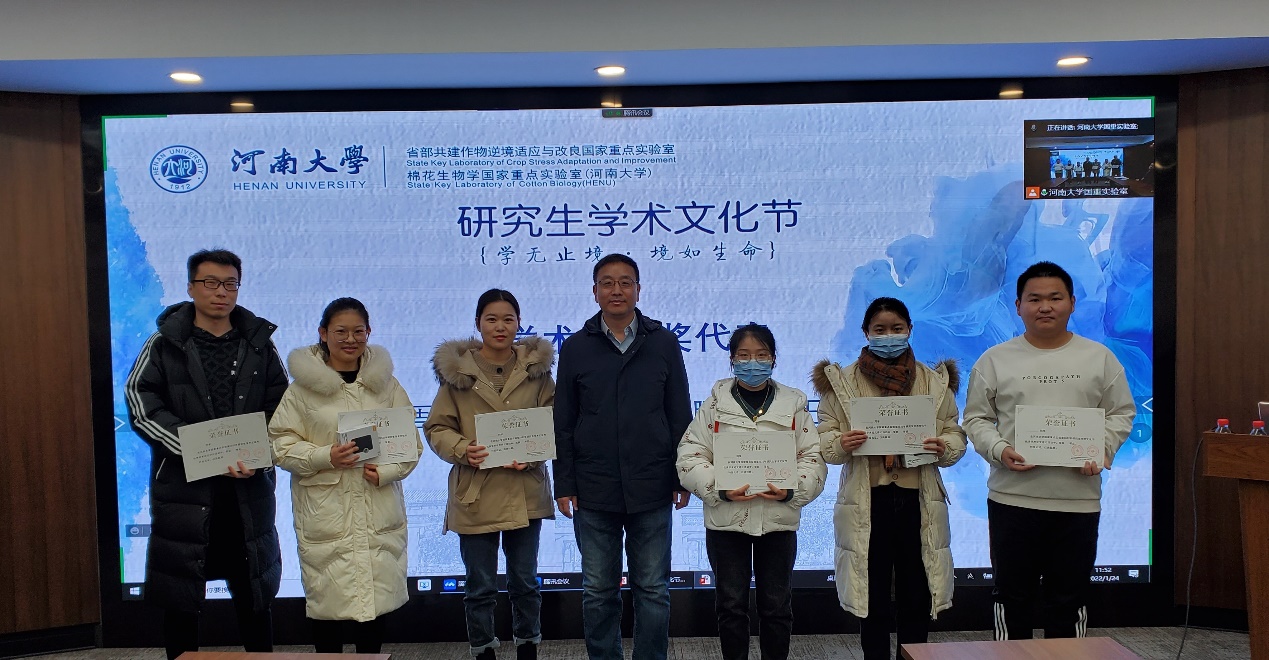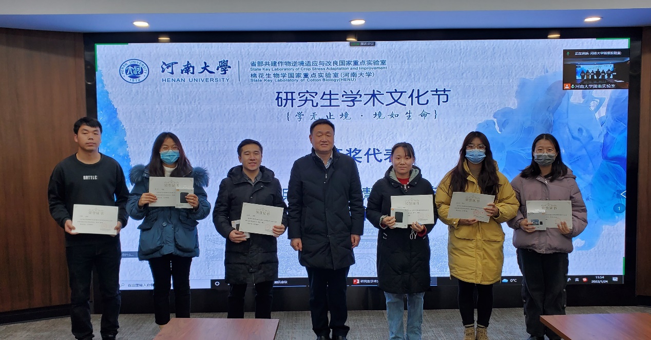 1月24日上午,河南大学国家重点实验室2021年研究生学术文化节颁奖仪式在省部共建作物逆境适应与改良国家重点实验室一楼会议室召开。校长、省部共建作物逆境适应与改良国家重点实验室主任宋纯鹏教授,副校长王学路教授,副校长、生命科学学院院长张立新教授,生命科学学院党委书记吴建伟,农学院党委书记王磊,农学院执行院长王道杰,省部共建作物逆境适应与改良国家重点实验室、棉花生物学国家重点实验室主要领导,国家重点实验室部分研究生导师及获奖学生代表出席颁奖仪式,颁奖仪式由河南大学棉花生物学国家重点实验室副主任赵翔主持。