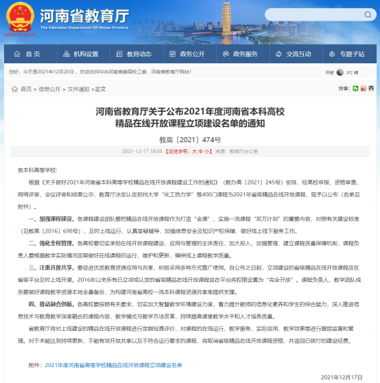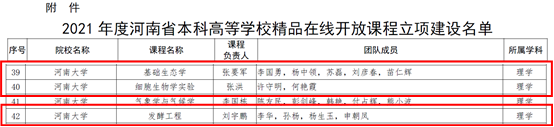 近日,河南省教育厅公布2021年度河南省本科高校精品在线开放课程立项建设名单,我院刘宇鹏教授主持的《发酵工程》、张洪博士主持的《细胞生物学实验》和张要军博士主持的《基础生态学》在列。
