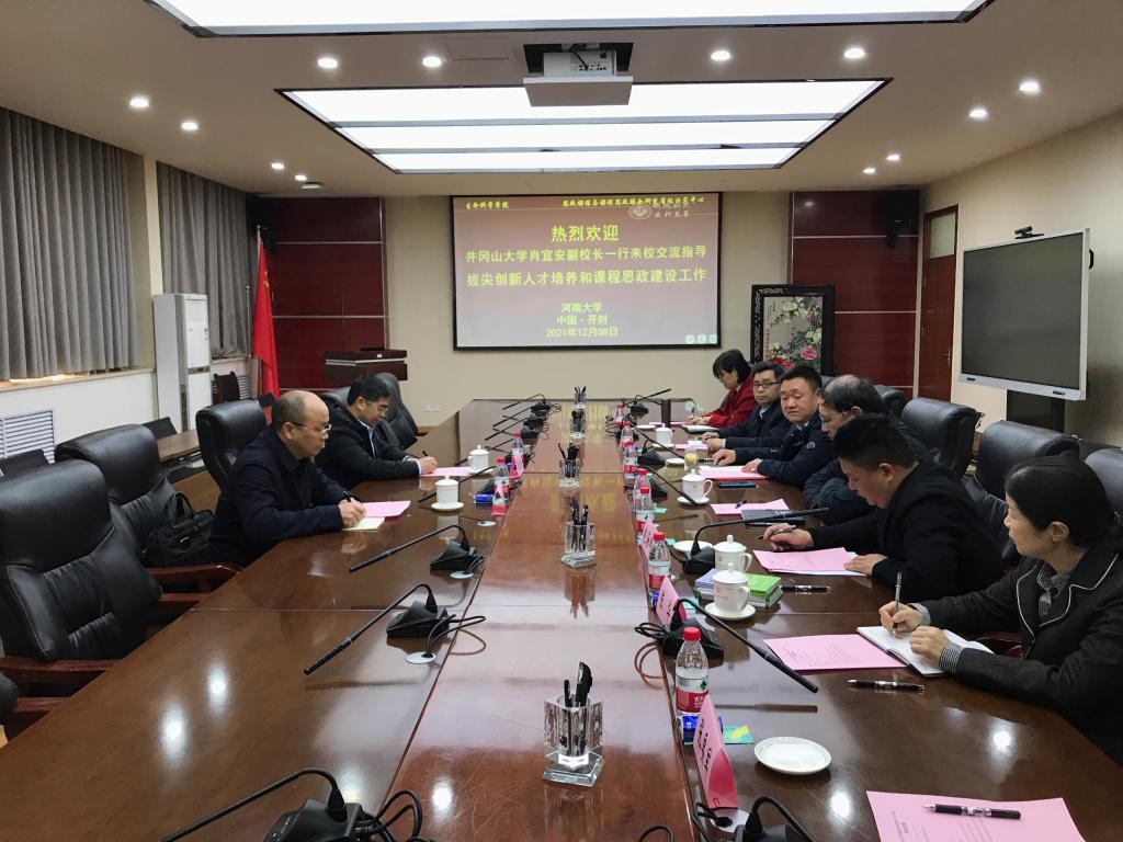12月8日,井冈山大学副校长肖宜安、生命科学学院院长黄族豪一行来访;河南大学副校长张立新,教务处副处长朱显峰,生命科学学院执行院长王刚、副院长赵海鹏等出席交流会,会议由赵海鹏主持。