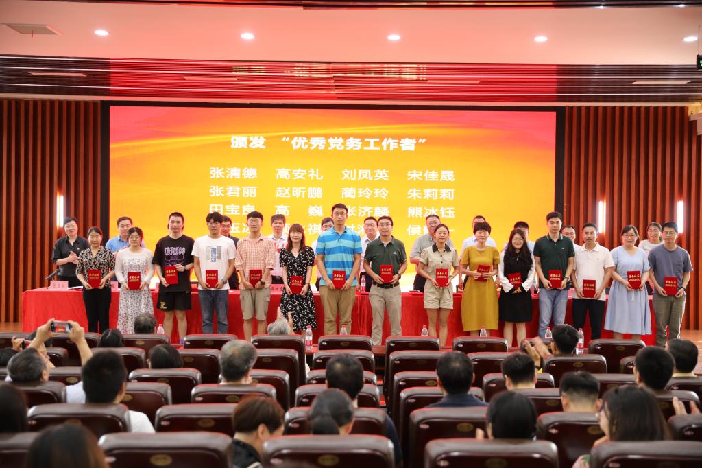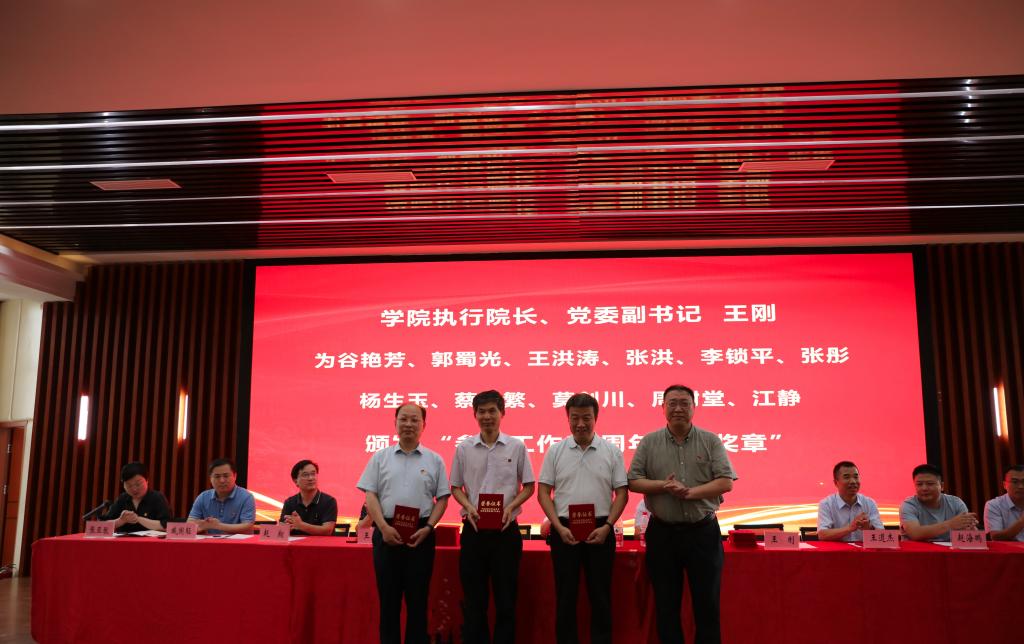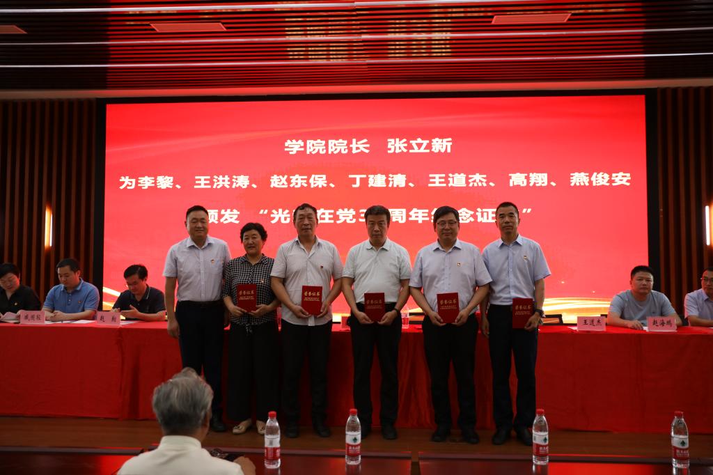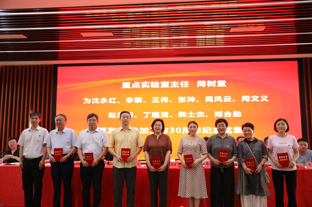 伴随着颁奖音乐,气氛庄重热烈。学院党委书记赵东保为潘洪叶同志颁发“光荣在党50年纪念奖章”,院长张立新为李黎等7名同志颁发“光荣在党30年纪念证书”,学院执行院长王刚、棉花生物学国家重点实验室主任周树堂为谷艳芳等22名教师颁发“工作30年纪念证书”,学院党委委员、班子成员为先进基层党组织、优秀共产党员、优秀党务工作者颁发获奖证书。