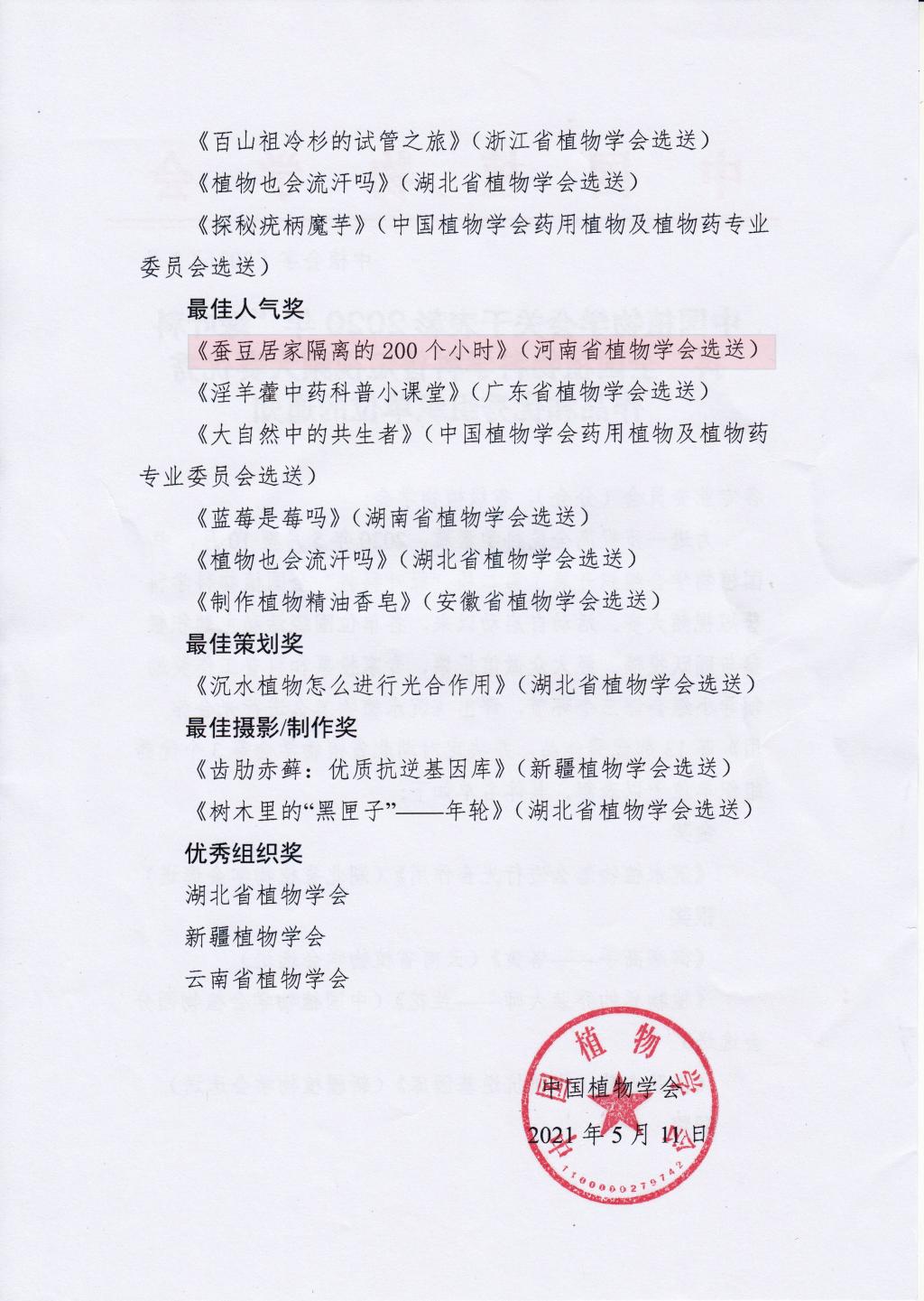 2021年6月6日从河南省植物学会获悉,我院代表河南大学以及河南省植物学会参赛短视频作品《蚕豆居家隔离的200个小时》在本次大赛中荣获最佳人气奖。该作品是由我院2017级植物科学与技术系本科生李钊拍摄与制作,在刘路贤老师与徐小冬老师的指导下完成的。视频中详细记录了两颗蚕豆种子从破土而出到茁壮生长的过程,并围绕着生长过程中发生了哪些化学反应,是“谁”在支持和影响着它们的生长以及当遇到困难的时候它们又将如何巧妙应对等三个问题进行了逐一解答。