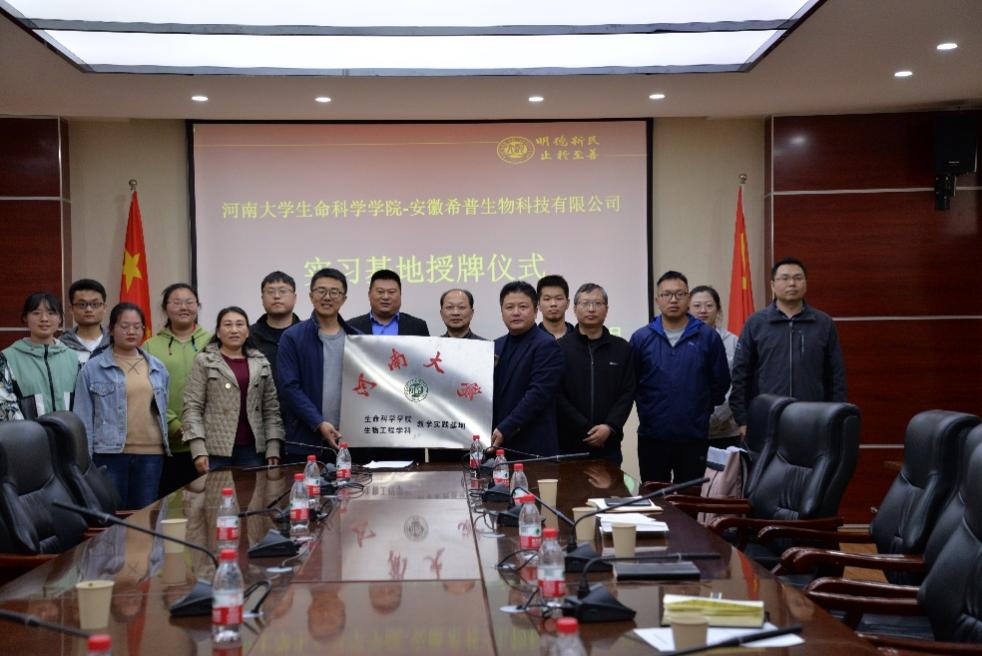 在授牌仪式上,赵海鹏介绍了河南大学及生命科学学院的基本情况,表示本实习基地的建设为我院生物工程专业学生的实习和就业搭建了良好的平台,希望双方建立友好合作长效机制,充分发挥各自优势,在人才培养、资源共享等多个方面加强合作,实现互惠共赢。赵大伟介绍了安徽希普生物科技有限公司的发展历史、科研情况、人才队伍及社会服务工作,希望以本次教学实践基地的建设为契机,加强同生命科学学院在科研创新、实习实践等方面的合作。