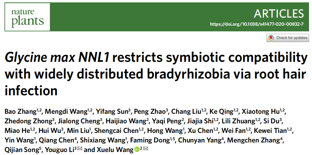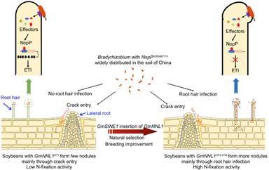 2021年1月15日,河南大学王学路教授团队和华中农业大学李友国教授合作在Nature Plants上发表了题为“Glycine max NNL1 restricts symbiotic compatibility with bradyrhizobia via root hair infection in soybean”的研究论文(doi : 10.1038/s41477-020-00832-7),揭示了大豆与根瘤菌共进化过程中根瘤菌由裂隙侵染向根毛侵染方式转变的遗传、分子和进化机制。研究人员首先构建了来自于世界各地的496份大豆核心种质自然变异群体;再根据接种慢生型根瘤菌后根瘤数目的表型,进一步通过全基因组关联分析结合遗传分析和分子生物学的方法,定位并证明了一个编码TIR-NBS-LRR蛋白的R基因(命名为GmNNL1,Nodule Number Locus 1)能够限制根瘤菌侵染大豆,降低大豆的根瘤数目。进一步分析发现,在大豆的自然选择、人工驯化以及与根瘤菌的共进化过程中,一类GmSINE1转座子的插入导致了该基因功能失活,使其只能编码截短形式的GmNNL1蛋白,从而促进了大豆对土壤中土著根瘤菌的识别,增加了大豆根瘤数量,进而显著提高了大豆单株固氮酶活以及地上部分生物量。GmNNL1主要在根毛中受根瘤菌诱导表达并主要影响根瘤菌的根毛侵染途径,而具有转座子插入的GmNNL1失活单倍型的出现,是导致根瘤菌侵染大豆由裂缝侵染向根毛侵染转变的重要原因。进一步通过质谱鉴定、生化和遗传分析发现,全长的GmNNL1蛋白通过与根瘤菌的三型分泌系统效应蛋白NopP直接相互作用激活ETI从而抑制大豆与根瘤菌的共生。该研究不仅揭示了大豆与根瘤菌互作过程中宿主与寄主匹配性的遗传和分子机制,还阐释了根瘤菌与大豆共进化过程中根瘤菌由裂缝侵染演化成高效的根毛侵染过程的重大分子事件,也为大豆高效固氮的分子设计育种提供了重要理论依据和目标基因。