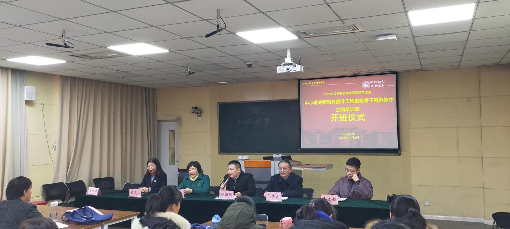 2020年12月6日,2020年义务教育师资薄弱环节改善中小学教师素养提升工程省级骨干教师初中生物学培训班开班仪式在开云kaiyun网页版官网举行,来自全省各地的培训班学员50名,学院副院长赵海鹏、成人教育办公室主任李黎、生物科学系主任刘凌云、培训班课程安排负责人闫文义等出席开班仪式,仪式由闫文义主持。