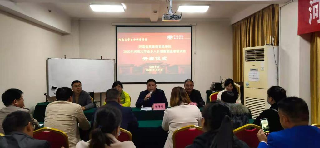 11月11日下午,河南省2020年高素质农民培训—河南大学返乡入乡创新创业者培训班开班仪式在开封中州银座商务酒店三楼会议室举行,生命科学学院副院长赵海鹏,继续教育办公室主任李黎,植物科学与技术系主任高安礼,本次课程管理负责人闫文义教授出席开班仪式,仪式由闫文义教授主持。