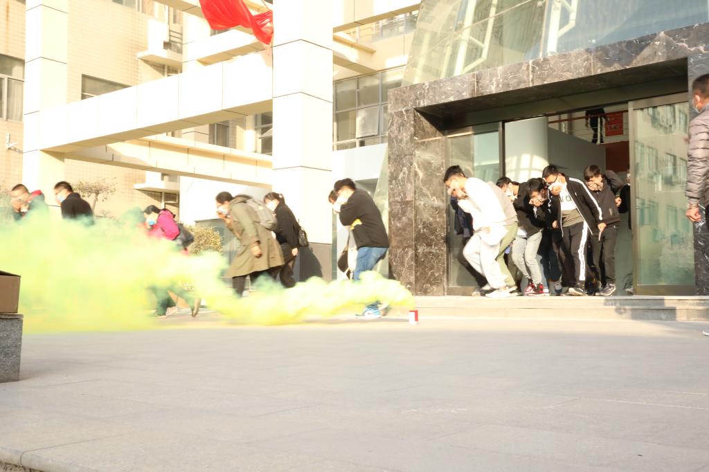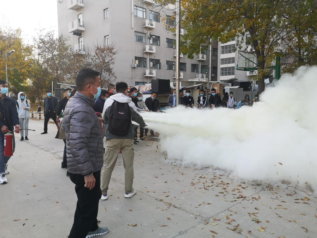在消防疏散和应急演练环节,马建军对灭火器分类及使用方法,演练规则及应注意事项进行了讲解说明,要求参演师生听从指挥,有序逃离、正确使用灭火器具。随后,学院楼前“烟雾弥漫”,学院师生在工作人员的引导下,用湿毛巾掩口鼻,采取弯腰、低姿的方式不断从“失火”的楼道中奔出,迅速逃离到安全区域,真切的体验了一次“火场逃生”。在楼外预设的火灾现场,学院师生积极参与,认真操作,用灭火器对准火焰底部进行灭火。