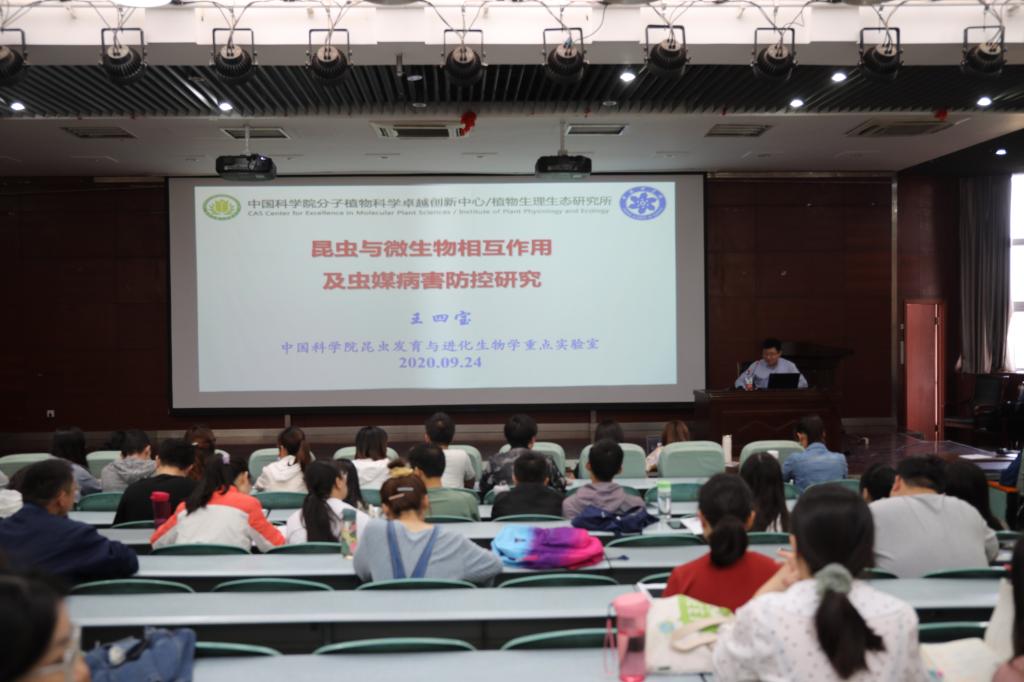 2020年9月24日上午,总第164期、2020年第2期“生物学前沿学术交流研讨会”(Biology cutting-edge Academic Exchange Seminar,简称“BAES”)在生命科学学院圆形报告厅举行。中国科学院上海植物生理生态研究所课题组组长王四宝应邀在此作题为“昆虫与微生物相互作用”的学术报告。来自生命科学学院的近500名研究生和本科生出席了报告会。报告会由棉花生物学国家重点实验室主任周树堂教授主持。