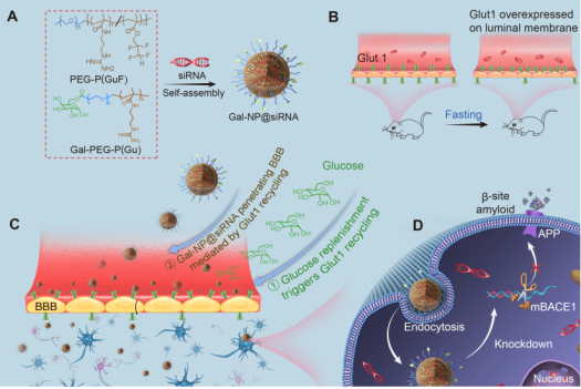 基于以上背景,河南大学-麦考瑞大学生物医学联合创新中心开发了一种糖基化三重作用力稳定的高分子siRNA纳米药物(Gal-NP@siRNA),用于靶向APP/PS1转基因阿尔茨海默症小鼠模型中的BACE1。Gal-NP@siRNA具有良好的血液稳定性,同时利用血糖控制BBB内皮细胞上葡萄糖转运蛋白Glut1的运转来促进siRNA纳米药物对BBB的渗透,从而确保siRNA有效降低BACE1表达和淀粉样斑块的聚集,抑制磷酸化Tau蛋白的产生,并促进髓鞘再生。动物实验结果显示,Gal-NP@siBACE1恢复了阿尔茨海默症模型小鼠退化的认知能力,且没有明显的副作用。