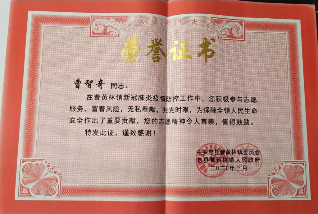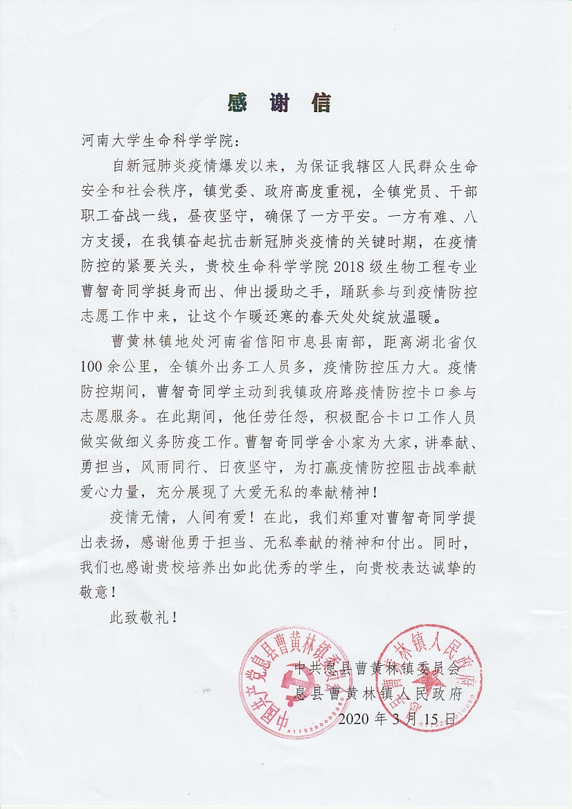 近日,学院收到一份来自信阳市息县黄林镇党委镇政府的感谢信,信中对曹智奇同学为乡镇防疫工作做出的突出贡献表示感谢。信中写到自新冠肺炎疫情发生以来,曹智奇同学积极响应组织号召,第一时间报名参加了志愿服务工作,出色地完成了疫情检查点的防疫宣传和执勤工作。在志愿服务期间,他工作认真负责,展现了开云kaiyun网页版官网学子良好的精神面貌和责任担当,为构筑疫情防控的人民防线贡献了青春力量。