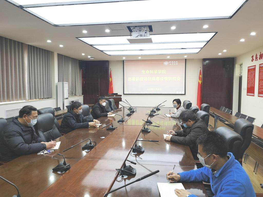 1月29日下午,生命科学学院在B201会议室召开疫情防控工作专题研讨会议,学院党政领导班子成员参加会议,会议由学院党委书记赵东保主持。