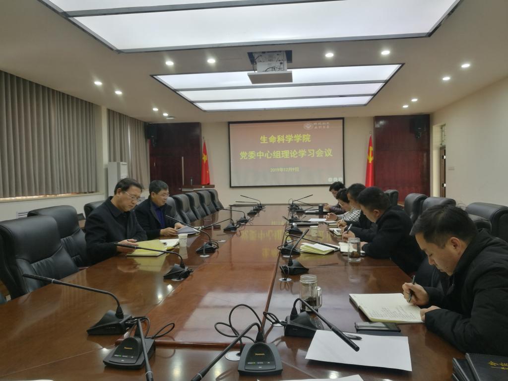 为进一步扎实推进“不忘初心、牢记使命”主题教育,深入学习贯彻党的十九届四中全会精神,12月9日上午,生命科学学院党委在学院B201会议室召开中心组理论学习会议,集体学习党的十九届四中全会精神。学院党委委员、班子成员参加学习。会议由学院党委书记赵东保主持。