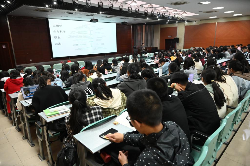 11月15日下午,生命科学学院本科生职业规划引导在圆形报告厅三楼举行,全国优秀教师、河南大学“攀登计划”特聘教授、作物逆境适应与改良国家重点实验室副主任徐小冬教授作《求战者安,求安者亡》专题讲座,2019级全体本科生到场聆听报告。讲座由生命科学学院党委副书记张亚歌主持。