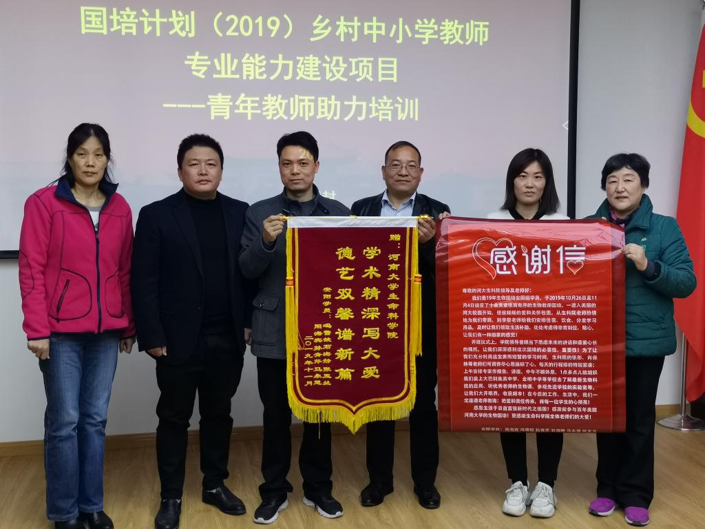生命科学学院副院长赵海鹏、生物科学系系主任张彤、成人教育办公室主任李黎和本次国培生物班班主任肖保林代表学院接收了锦旗和感谢信。