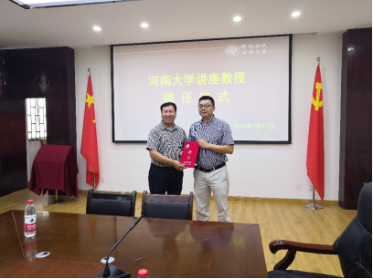 7月11日下午,我校讲座教授聘任仪式在生命科学学院B201会议室举行,白仲虎教授受聘为河南大学讲座教授。生命科学学院常务副院长苗雨晨出席仪式并向白仲虎教授颁发聘书,学院副院长王道杰、生物工程系主任杨生玉等专业教师及研究生参加了聘任仪式。仪式由学院副院长王道杰主持。