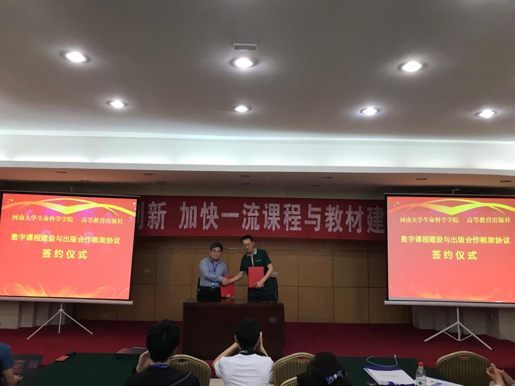 5月19日,学院与高等教育出版社在郑州河南饭店举行数字课程建设和教材出版合作框架协议的签订仪式。副院长安国勇代表学院与高等教育出版社签署协议,共同推进《动物学》等4门数字教材的正式出版和《植物生理学》等8门数字教材的编写规划工作。谷艳芳、李锁平、张洪等老师分别代表《动物学》、《遗传学》、《细胞生物学实验》和《微生物学》这4门数字教材的编委与高等教育出版社签订正式出版合同。学院的十几位教师参加并见证了本次签约活动。