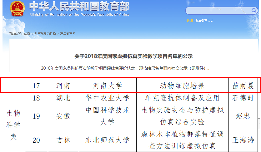 近日,根据教育部高等教育司发布的关于2018年度国家虚拟仿真实验教学项目名单的公示,由我院苗雨晨教授主持、张洪等老师参与申报的《动物细胞培养》成功入选2018年度国家虚拟仿真实验教学项目,这是我校生物学入选“双一流”学科建设以来国家级教学项目的一个重大突破。