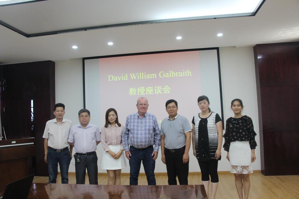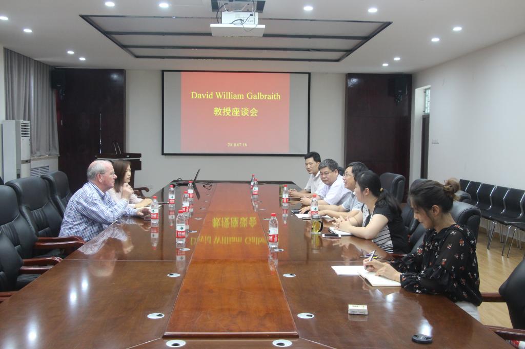 7月18日,“作物逆境生物学创新引智基地”海外学术大师、美国亚利桑那大学加尔布雷斯教授受邀来我校进行学术交流访问。生命科学学院党政班子成员、明德班班主任及相关人员于学院B201会议室与加尔布雷斯教授进行座谈。座谈会由党委书记赵东保主持。