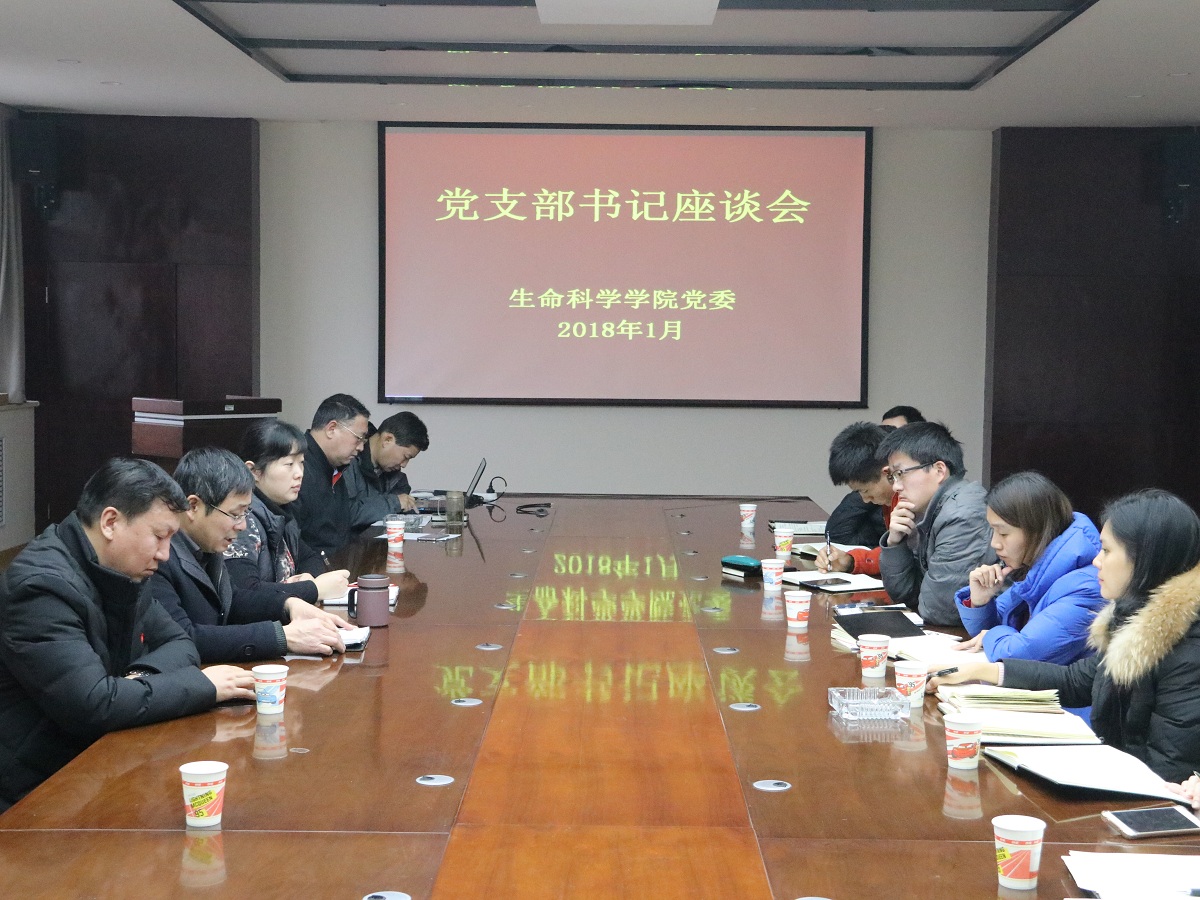 2018年1月18日下午,生命科学学院全体党委委员、各党支部书记在学院B201会议室召开学院2017年度党支部书记座谈会,会议由学院党委副书记肖艳主持。12名党支部书记主要就任职以来工作概况进行汇报。