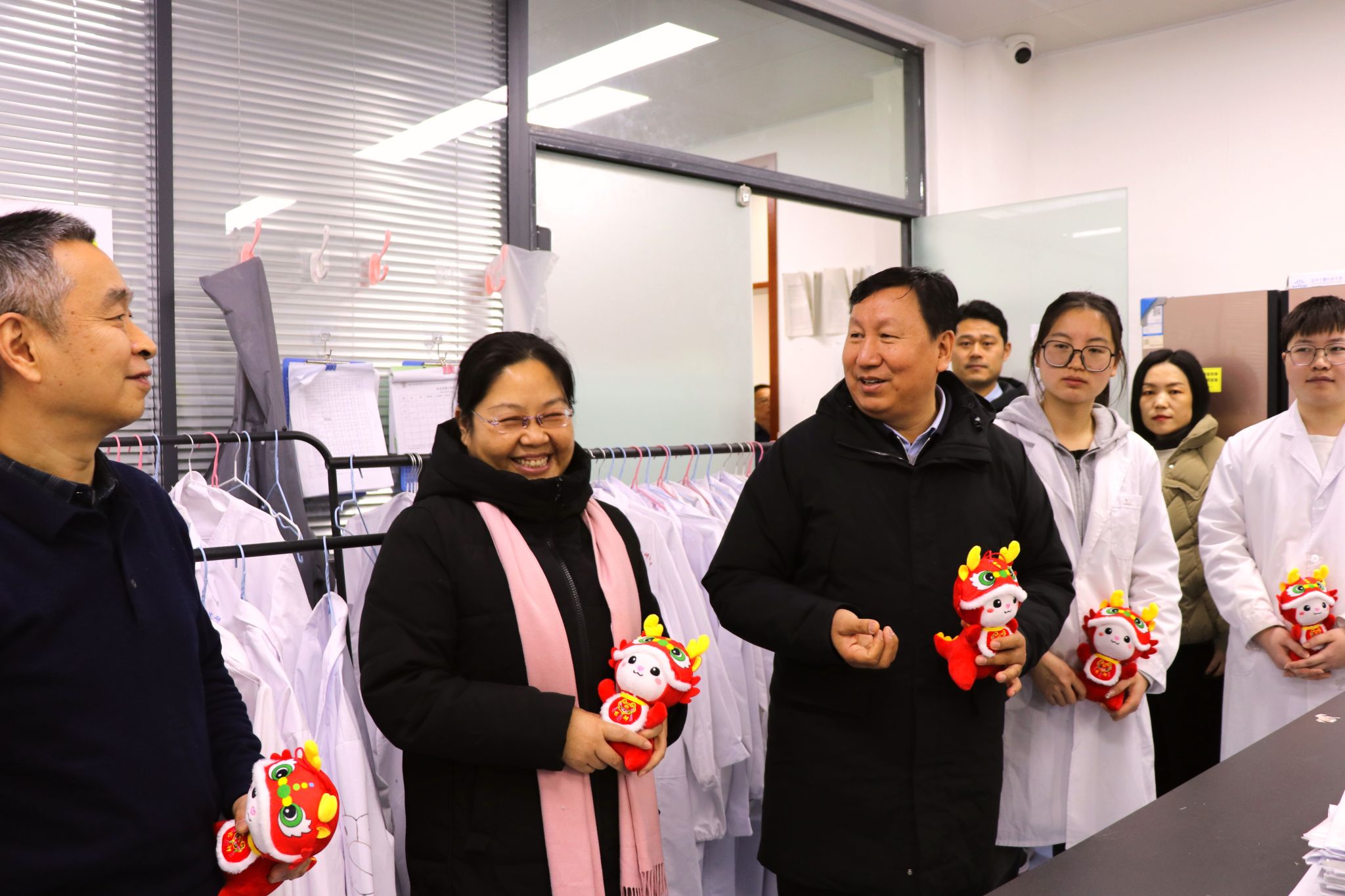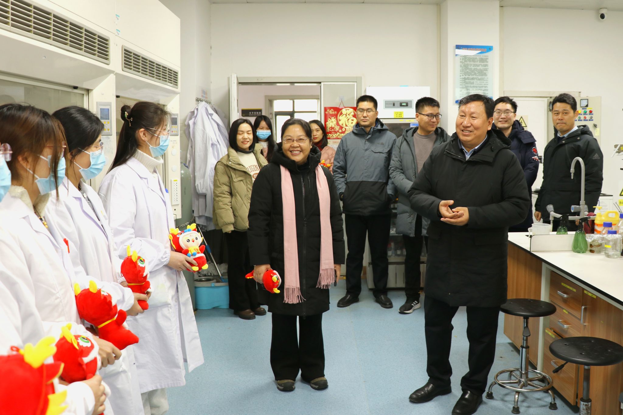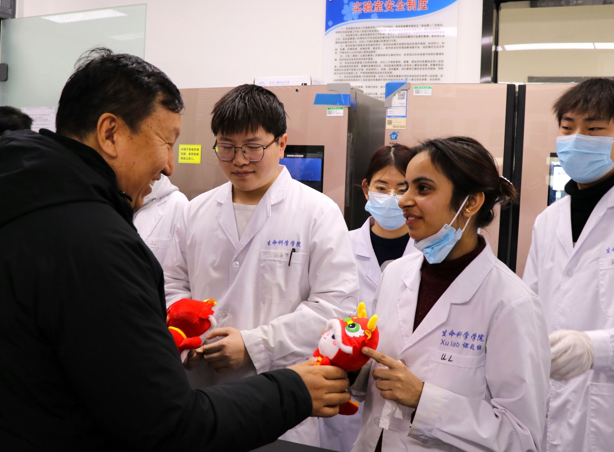 苗雨晨到肿瘤病理生物学实验室、脑靶向生物纳米药物重点实验室,与留校研究生和导师进行亲切交谈,详细询问了假期安排、生活情况和学习计划,对师生假期仍坚持科研学习表示肯定。他讲到,创办研究型综合性国际化的一流大学,不仅要有传道授业的导师,也要有探索创新、扎根科研的人才。做学问、搞研究就该孜孜不倦、不惧艰辛,按照科学合理的规划开展学习,才能产出高质量成果。他叮嘱学生在校期间注意雨雪天气的安全防护,加强自我保护意识,遵守消防安全规定,尽早完成科研任务。最后,苗雨晨为大家送上学院准备的龙年公仔,并祝愿师生身体健康,龙年大吉。