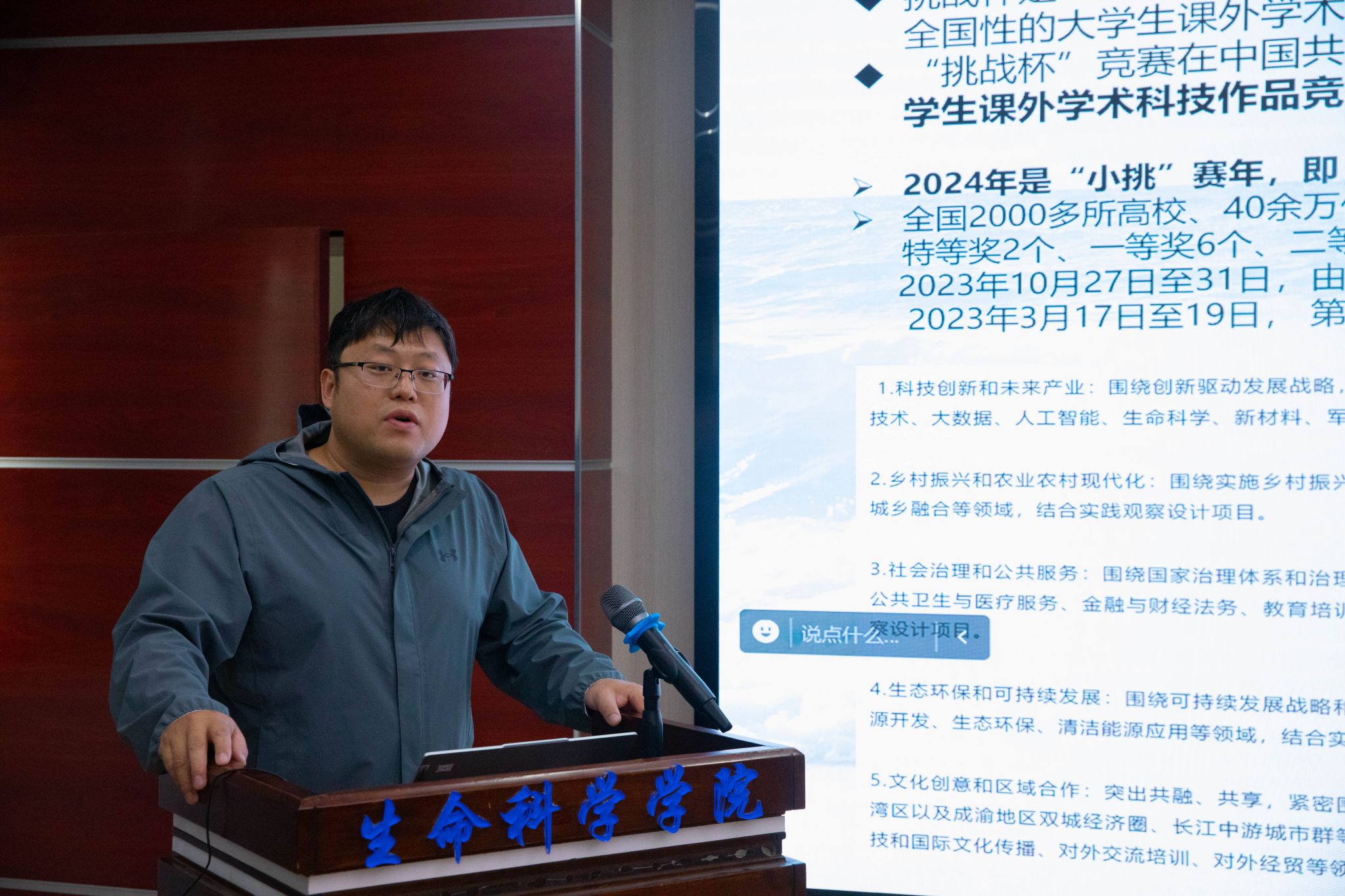 为帮助学生全面了解和掌握“挑战杯”赛事,拓宽学生新视野、激发学生创新潜力与活力,10月24日,生命科学学院在学院B201举办第十六届“挑战杯”大学生学术科技作品竞赛院级选拔赛启动活动,邀请中国国际大学生创新大赛全国银奖项目指导教师孙杨作培训指导。会议由学院团委负责人宋晓峰主持。