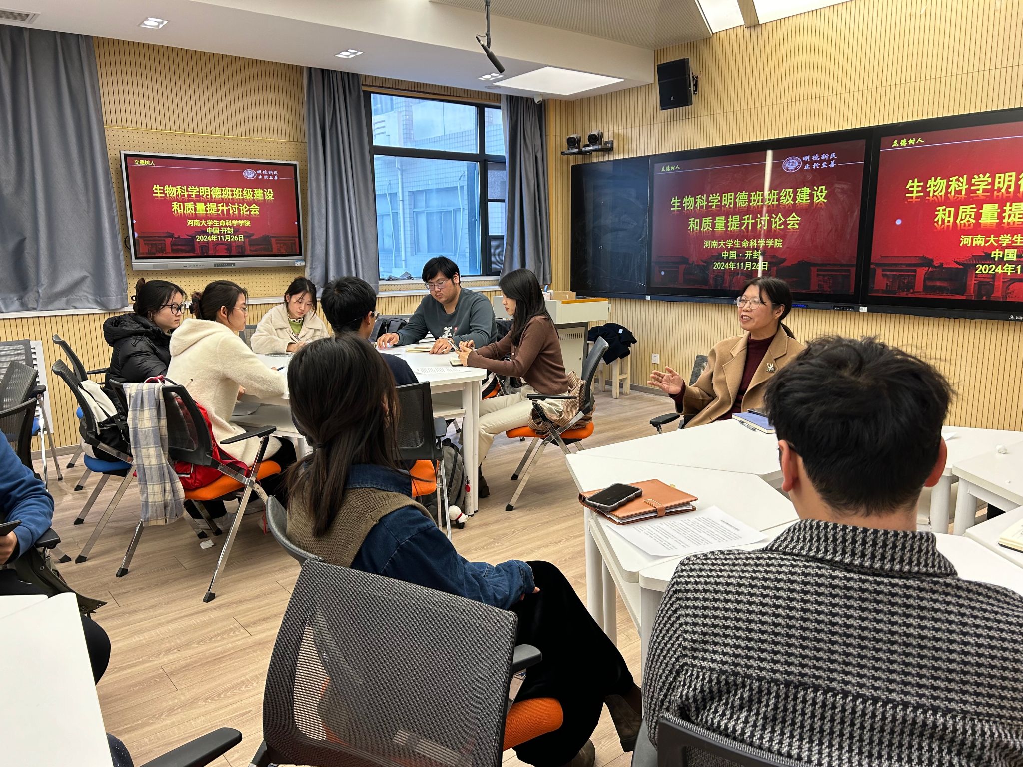 与会人员围绕培养方案、课程设置、班级建设和未来发展等方面开展讨论交流,对“4+4”本博一体化培养模式、“2+2”人才培养模式等教学改革方案进行了讨论交流。学生代表在发言中围绕班级建设、当前教学改革和本科生导师制等方面反馈意见和建议,与会教师认真听取并耐心解答。会上,与会人员就明德班在河南省生物学拔尖学生培养基地建设过程中的重要角色以及未来班级活动计划进行了深入讨论,就质量提升实施方案达成一致。