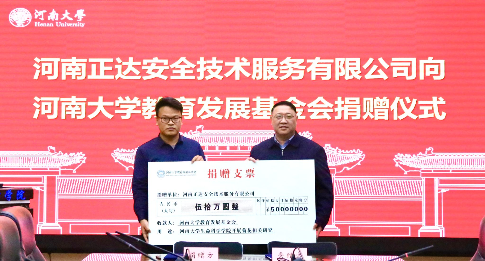 张立新代表学校向河南正达安全技术服务公司的爱心捐赠表示感谢,向朱文涛总经理关心和支持河南大学的发展表示感谢,并详细介绍了河南大学以及生物学科的历史沿革。他指出,河南大学正处于“双一流”“双航母”战略叠加的关键攻坚期,生物学科作为双一流建设学科,在科学研究、师资队伍、人才培养、社会服务等方面取得了优异成绩。他表示,朱总经理是生命科学学院杰出校友的代表,河南大学的发展离不开校友们的关注和支持。河南正达作为一家社会声誉斐然的安全技术服务企业尤其关注生命领域的发展,近年来一直与学院的菊花团队合作紧密,主动融入国家重大战略,对接行业发展需求,深化产学研融合,推动科技成果落地生根。他强调生命科学学院将科学规划、合理使用捐赠基金,通过校企合作助力双方发展。未来,学校和校友之间也将建立更加可持续、共赢发展的“校友+”联系,实现校友和学校事业同向同行、同频共振。