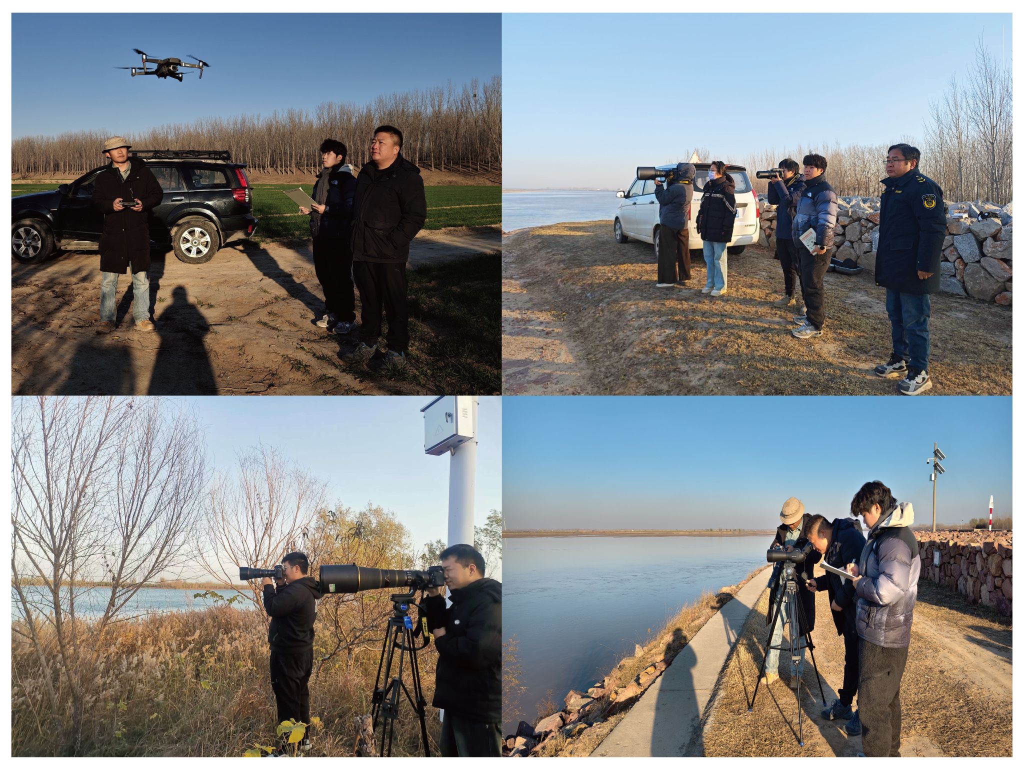 此次调查由学院副院长、课题组组长赵海鹏教授带队,课题组工作人员陈天恩,本科生导师制项目在读大学生李颢、孙美琪、苗飏、徐迎松和赵帝,河南大学春桐学社成员王俞博、邓姗姗和高媛美婧以及课题组硕士研究生李鹏举等人参与调查工作,开封市城乡一体化示范区农业农村局法制科(科学教育科)科长张建平协助调查。此次调查使用到了高倍望远镜对目标进行观测,使用单反相机、无人机对目标形态进行拍摄记录。