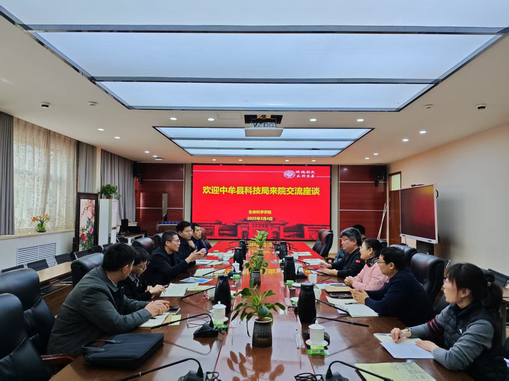 为加速生物学一流学科建设,推动科研成果向实际生产力转化,3月4日下午,中牟县科技局局长胡宇坤、副局长刘家一郎等人莅临学院,就校地合作事宜展开洽谈。副院长苏鹏,专家代表方敏、邹长松、李华、范媛媛以及学院平台建设与实验室管理办公室主任陈立超参加座谈会,会议由苏鹏主持。