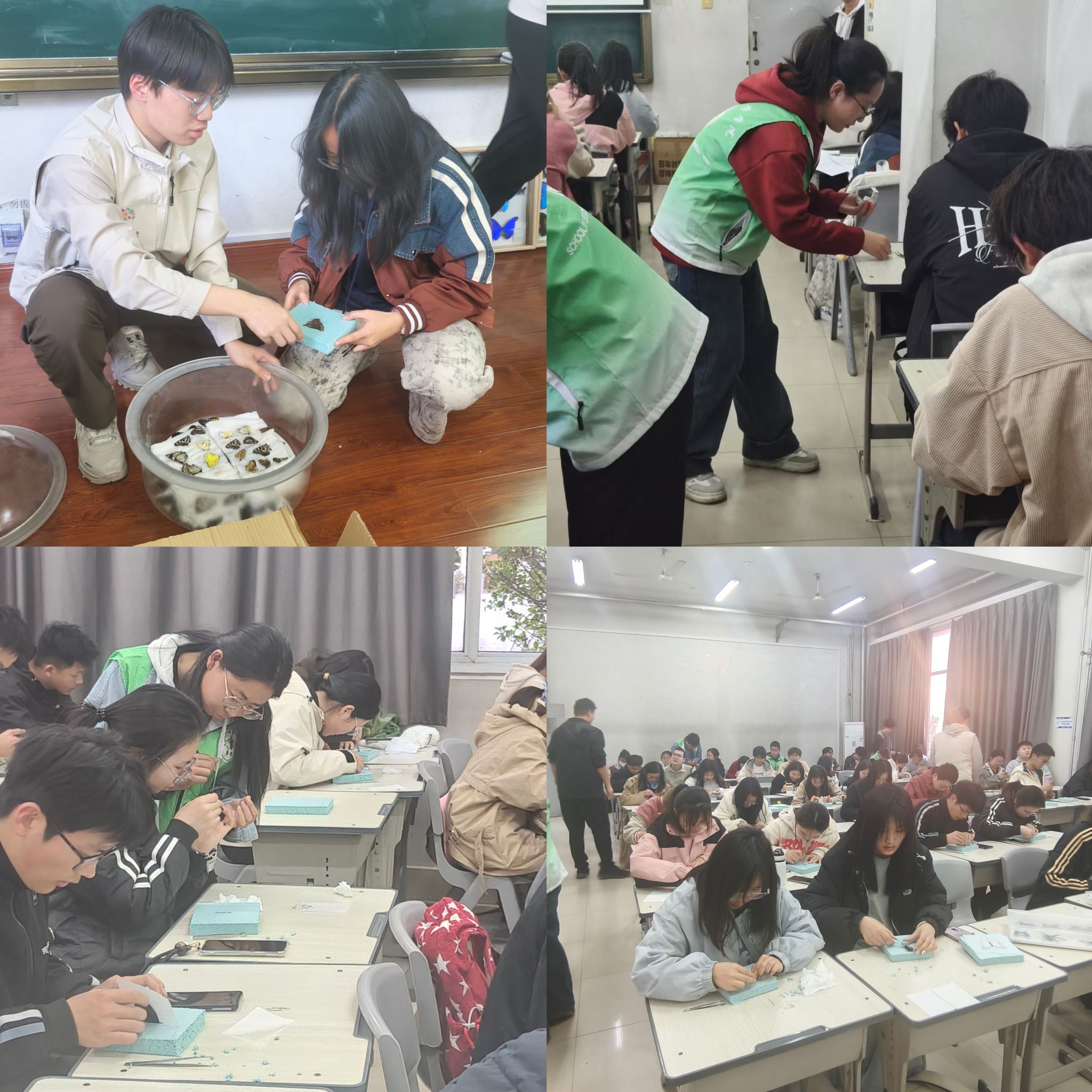 本次科普活动持续举办两场,包括动植物科普、蝴蝶标本制作等环节。在野生动植物科普讲解环节,科普志愿者凭借扎实的专业知识,以实物标本介绍了哺乳动物、鸟类、昆虫等生物的形态特征、生活习性及保护现状,结合实际案例剖析野生动物保护的法律法规与现实意义。互动问答环节将现场气氛推向高潮,学生们在思维碰撞中深化对生物多样性保护的理解。