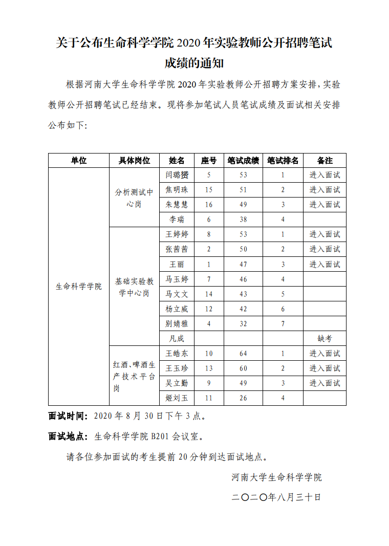 关于公布2020年实验教师(硕士)公开招聘笔试成绩的通知