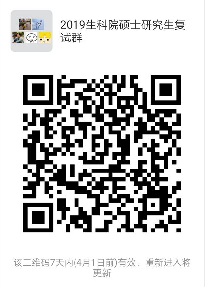 所有 2019 级复试的考生请加入生命科学学院 2019 级研究生复试微信群,相关信息也将在群里发布。发送验证请求时请注明专业+方向+姓名,否则不予验证。