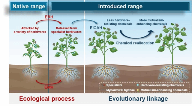 研究团队整合经典入侵生态学理论假说,结合现有植物次生代谢的实验证据,提出了“次生代谢物重分配推动外来植物入侵”的理论框架。该框架指出,当外来植物传入新生境后,往往能够逃离原生地天敌的制约(天敌逃逸假说),新的取食压力促使其减少防御性次生代谢产物的合成,特别是对地上植食性昆虫(进化增强竞争力假说);同时,外来植物将节约的资源重新分配至地下部分,增加促进丛枝菌根真菌共生关系的次生代谢产物投入,从而增强互利共生作用(增强共生假说),进一步推动其入侵进程(见图)。该理论有机整合了地上与地下多营养级互作、敌对与共生关系、以及次生代谢产物的分配策略,系统阐述了生物互作驱动外来植物入侵的内在机制和入侵过程中生态策略与进化适应的协同机制,对入侵生态学的理论发展具有重要意义(同行评价:“它标志着入侵生态学从描述现象迈向机制整合与理论构建的重要跃升”https://mp.weixin.qq.com/s/rspp3lpNZlUEkbO0ouVMgA)。