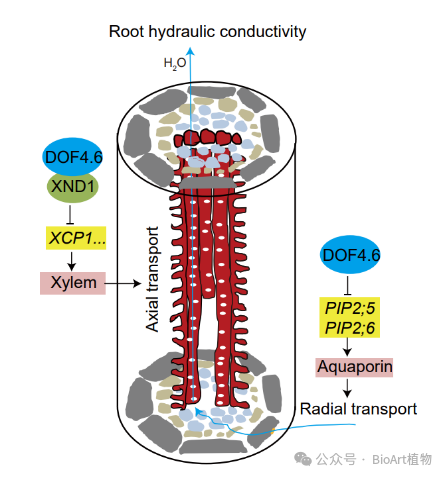 该研究通过互作蛋白筛选,鉴定转录因子XND1与DOF4.6之间存在相互作用,并进一步揭示两者在根系水分运输和干旱应答过程中均发挥负调控功能。深入研究表明,XND1和DOF4.6协同调节下游基因的表达,从而抑制根部木质部的形成。DOF4.6能够显著增强XND1与木质部发育相关的半胱氨酸蛋白酶基因XCP1启动子的结合能力,进而抑制其表达,对木质部发育进程产生影响。值得注意的是,DOF4.6还能够独立于XND1发挥功能,通过直接抑制水孔蛋白 PIP2;5和PIP2;6的表达,对水分径向运输发挥潜在的直接调节作用。