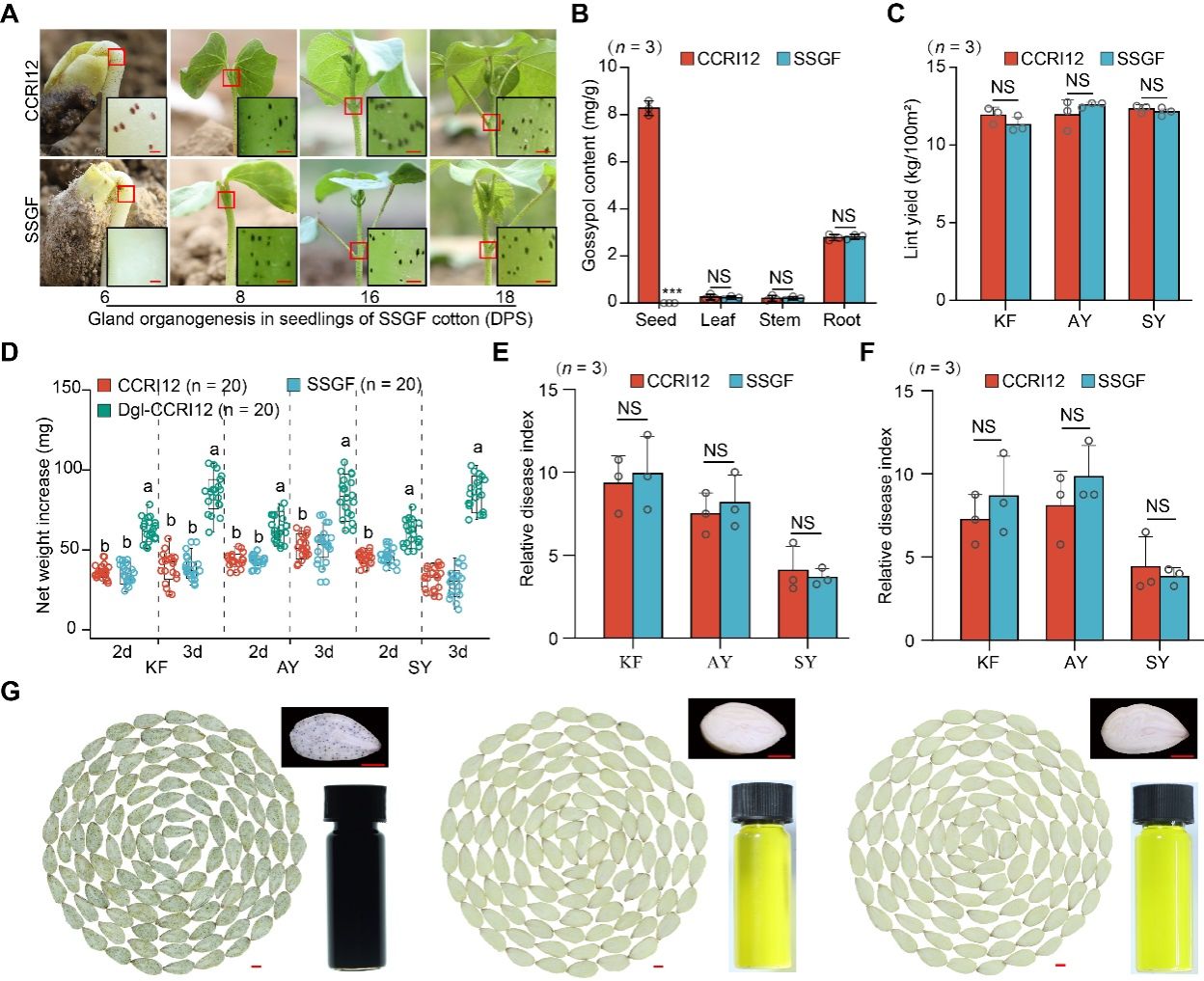 近日,河南大学宋纯鹏教授团队-邹长松教授课题组在Plant Communications在线发表题为Engineering seed-specific gossypol-free cotton for human-safe consumption by harnessing the dominant-negative effect of the Gl2e mutation的研究论文。该研究系统阐明了Gl2e显性负效应的作用机制,提出利用种子特异启动子驱动Gl2e基因、干扰种子腺体发育的新策略,成功培育出植株棉酚保持不变且种子棉酚含量为“0”的新型棉花,突破棉籽不可安全食用的国际难题,为棉花升级为“粮棉油”一体高值化作物提供依据。