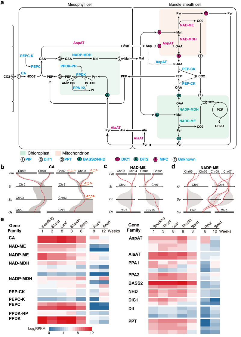 已有研究依据C4植物二羧酸的种类和参与脱羧反应的酶类,将C4途径分为三种亚型:1)依赖NADP的苹果酸酶的苹果酸型(NADP-ME型)、2)依赖NAD的苹果酸酶的天冬氨酸型(NAD-ME型)、3)具有PEP羧激酶的天冬氨酸型(PEP-CK型),PEP-CK型依赖于NADP-ME型或NAD-ME型而存在,糜子属于典型NAD-ME型。通过糜子与其它作物基因组的比较和转录组分析发现,糜子基因组中NADP-ME型和NAD-ME型相关的酶和转运蛋白不但同时存在,而且在光合作用组织中维持较高的表达水平。根据这些结果,研究人员提出了C4途径三种亚型可能同时存在于糜子中,这种机制可能有助于糜子更好的应对大田环境的的动态变化。