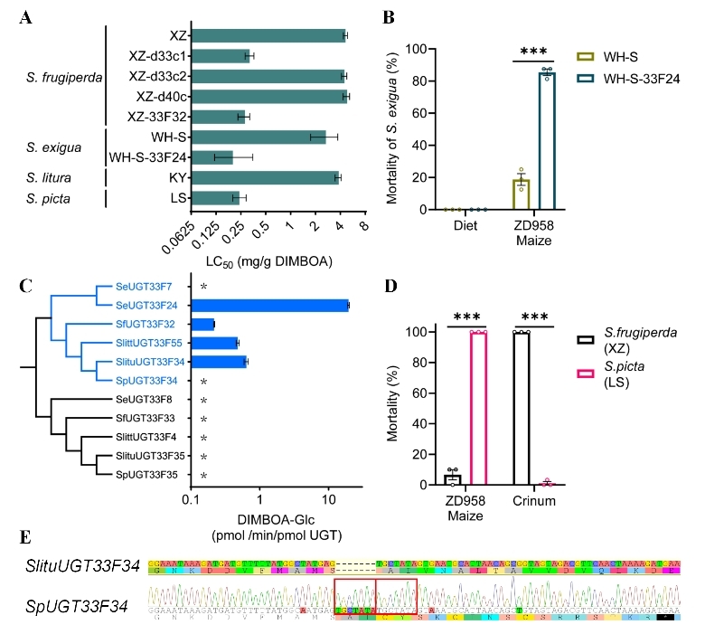 图1.SfUGT33F32直系同源基因是灰翅夜蛾属昆虫解毒丁布的关键基因