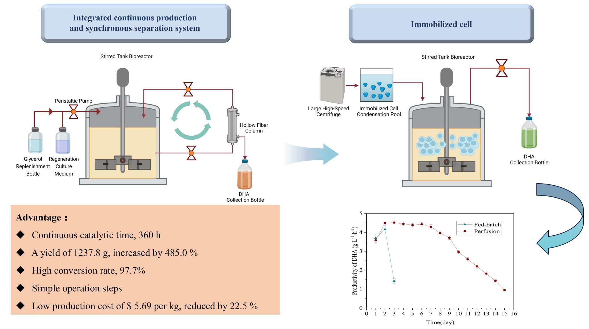 该团队通过利用中空纤维柱灌流技术和固定化细胞构建了一种新型的连续生产和同步分离(ICSS) 集成系统,并对细胞的时序寿命进行了研究,发现添加酵母提取物和硫酸镁可以复苏细胞的生物催化能力,实现DHA长期的高效率生产。同时结合恒化器的理念构建了相应的动力学模型,并且增加了固定化细胞来处理未消耗的甘油,降低成本的同时又大大提高了下游结晶纯化效率。在最佳的运行条件下,高效微生物连续化催化生产技术新策略促进DHA产量提高4.85倍,大大提高了DHA的生产效益。ICSS系统不仅适用于DHA的生产,还可以应用于其他物质的连续化生产工艺开发。在可持续生物生产过程中具有很大的应用潜力,为利用微生物进行工业高附加值产品生产提供了一种新的思路。