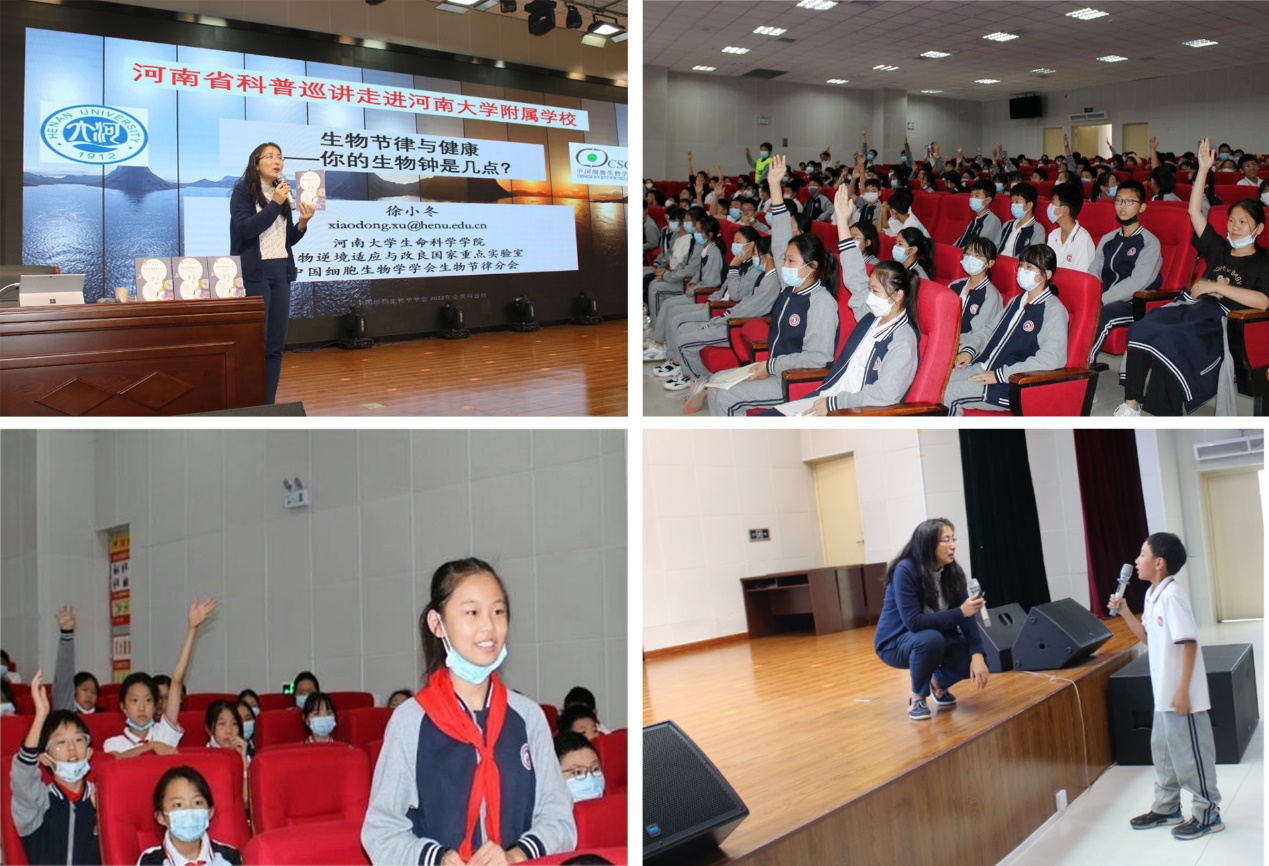 金秋送爽、丹桂飘香。为响应中国科协、中国细胞生物学学会等18部门“喜迎二十大,科普向未来”的号召,在全社会营造爱党爱国、热爱科学、崇尚创新的良好氛围,激发青少年的创新创造潜能,我院师生于9月23日赴郑东新区河南大学附属学校为中小学生开展“生物节律与健康”主题科普活动。徐小冬教授带队,青年教师王来副教授、袁力博士、高凯博士,研究生代表陈梦真、陈天恩、岳淑敏参加了活动。