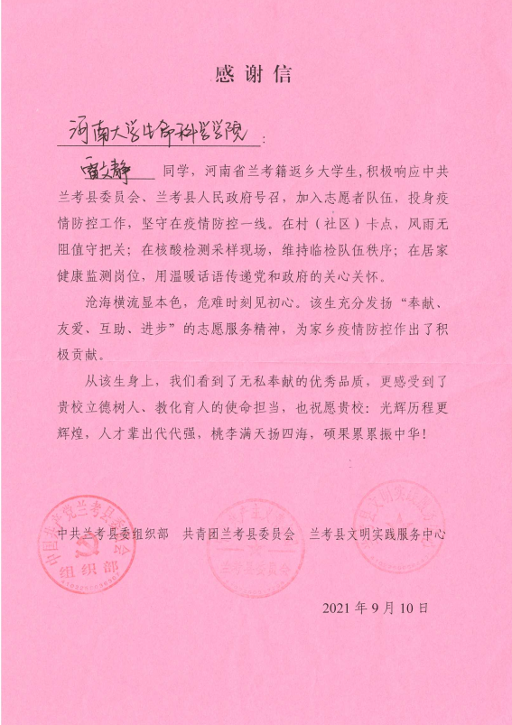 2021年11月24日上午,生命科学学院收到来自兰考县人民政府的一封感谢信,信中真诚感谢了我院硕士研究生雷文静同学主动请缨争当疫情防控志愿者、为当地疫情防控工作无私奉献提出高度肯定和表扬,对我校在培养学生爱国主义、集体主义和道德素养方面所作的教育工作表示感谢。