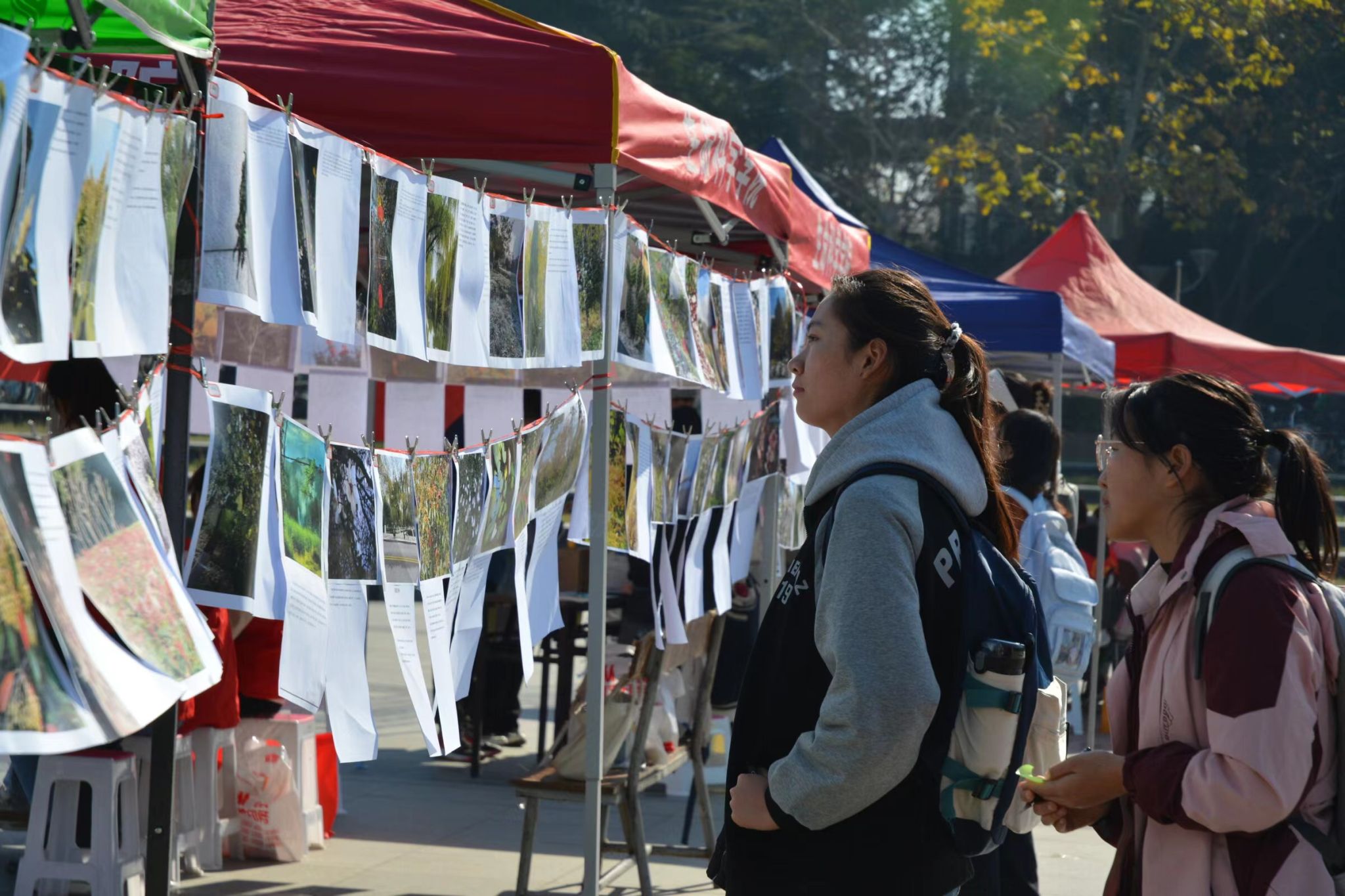 经征集以来,全校学生积极参与,来自14个学院近200名学生参加此次活动,共征集118幅优秀参赛作品。这些作品内容来源于校园植物、景区花卉和湖边风景等,一棵长在路边的野草、一抹枯树开出的绿芽,一朵绚丽多彩的菊花,镜头真切地记录了它们的美丽。活动展出现场,上百幅作品悬挂在马可广场进行展览,在阳光的照耀下,光与影的碰撞,带来了一场艺术视觉盛宴,吸引了众多在校师生驻足观赏。其中,《大自然的万花筒》作品前人气爆棚,参观者纷纷感到惊奇,不禁问到,“这个颜色的菊花,原来好像没有见到过,它怎么是彩色的呢?是后期染色的吗?”活动现场对彩色菊花背后的“秘密”展开了热烈的讨论,志愿者们就此问题也给予了专业的解答。
